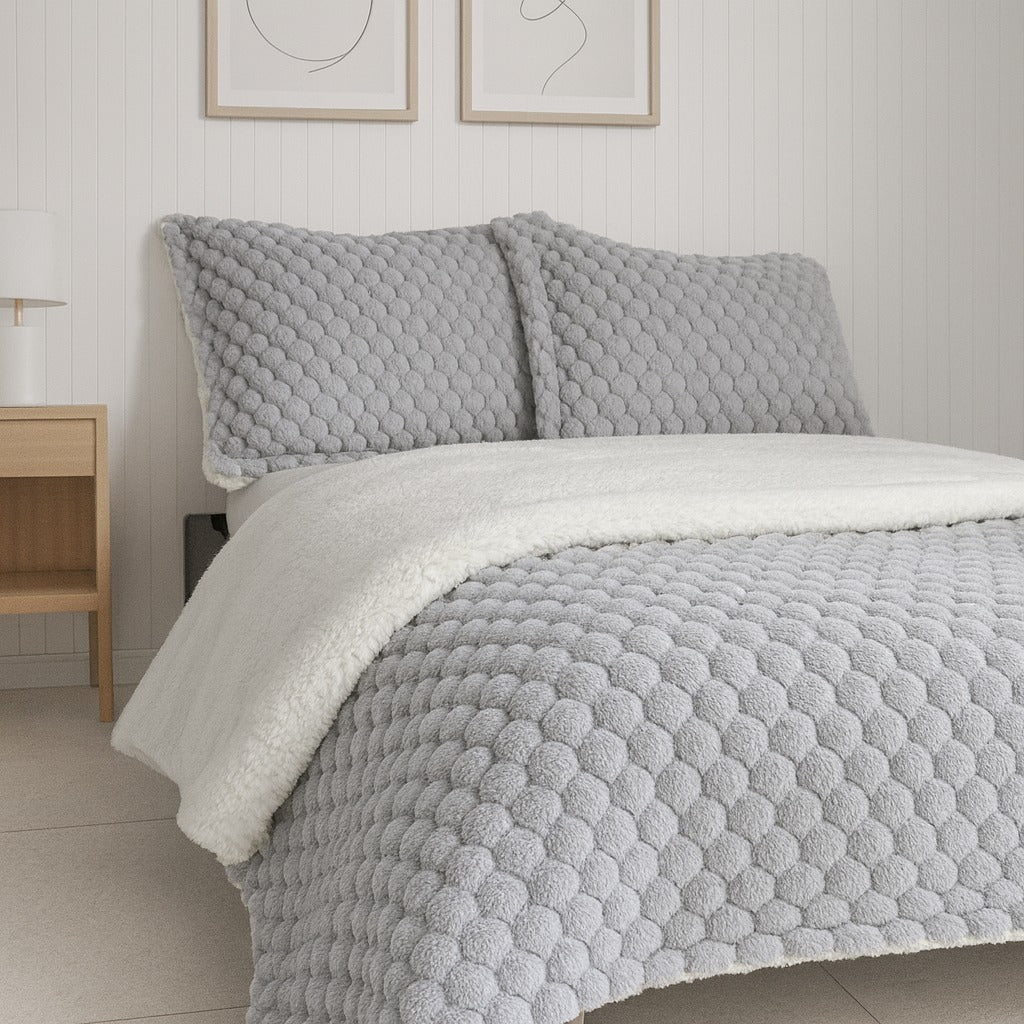 COMBO COBIJA OVEJERA GRIS SUAVE + 2 FUNDAS